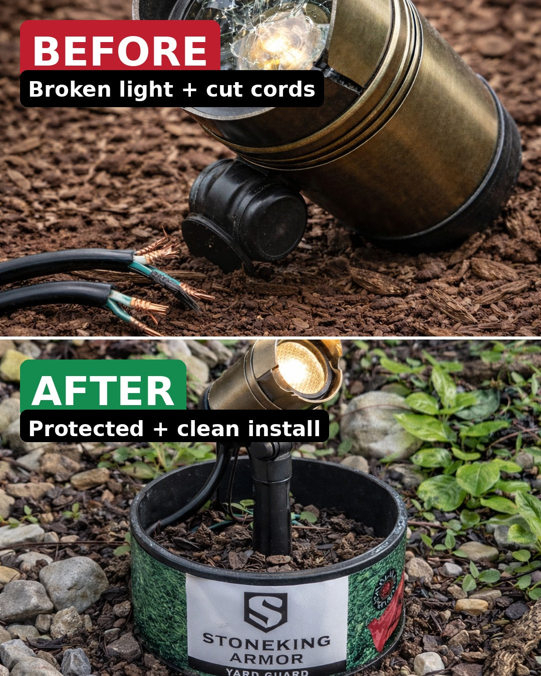 Stoneking Armor™️ Yard Guard is a tough, visible ground guard that protects those vulnerable spots—so you’re not replacing fixtures, re-leveling lights, or dealing with snapped lines all spring.